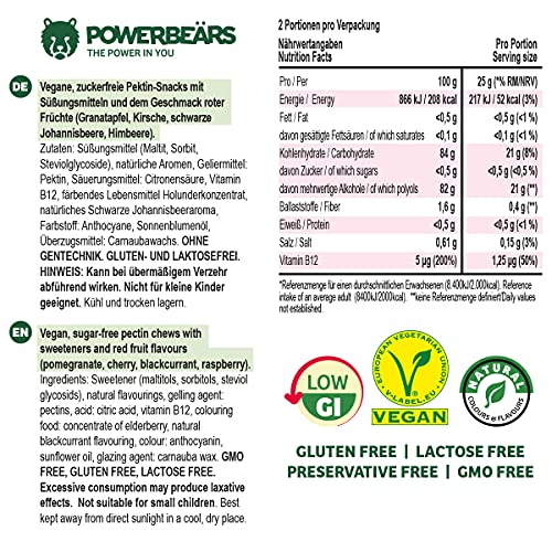 Specificaties: Powerbeärs Vegan Sugarfree Red Fruits | Vitamin B12 | Pomegranate, Cherry, Blackcurrant and Raspberry (8x50g)